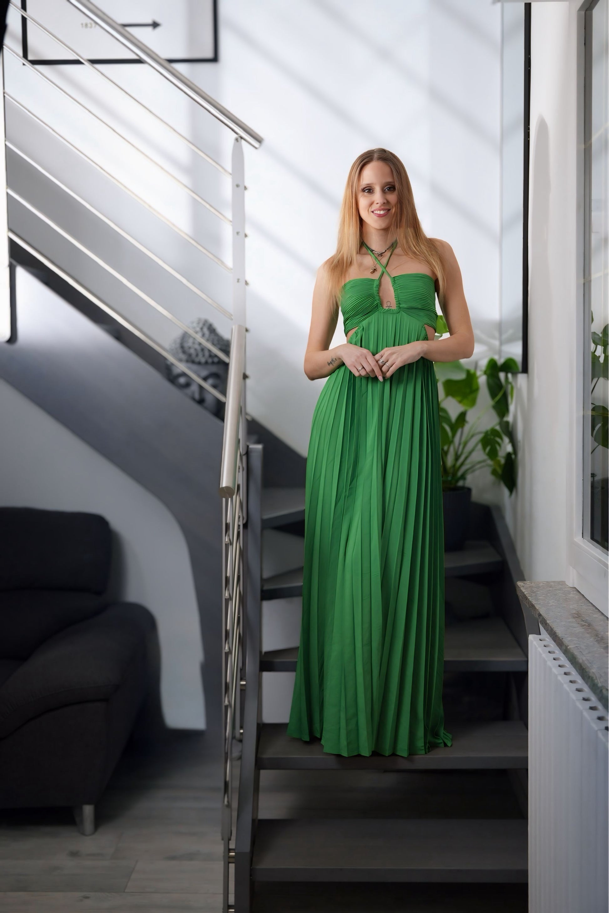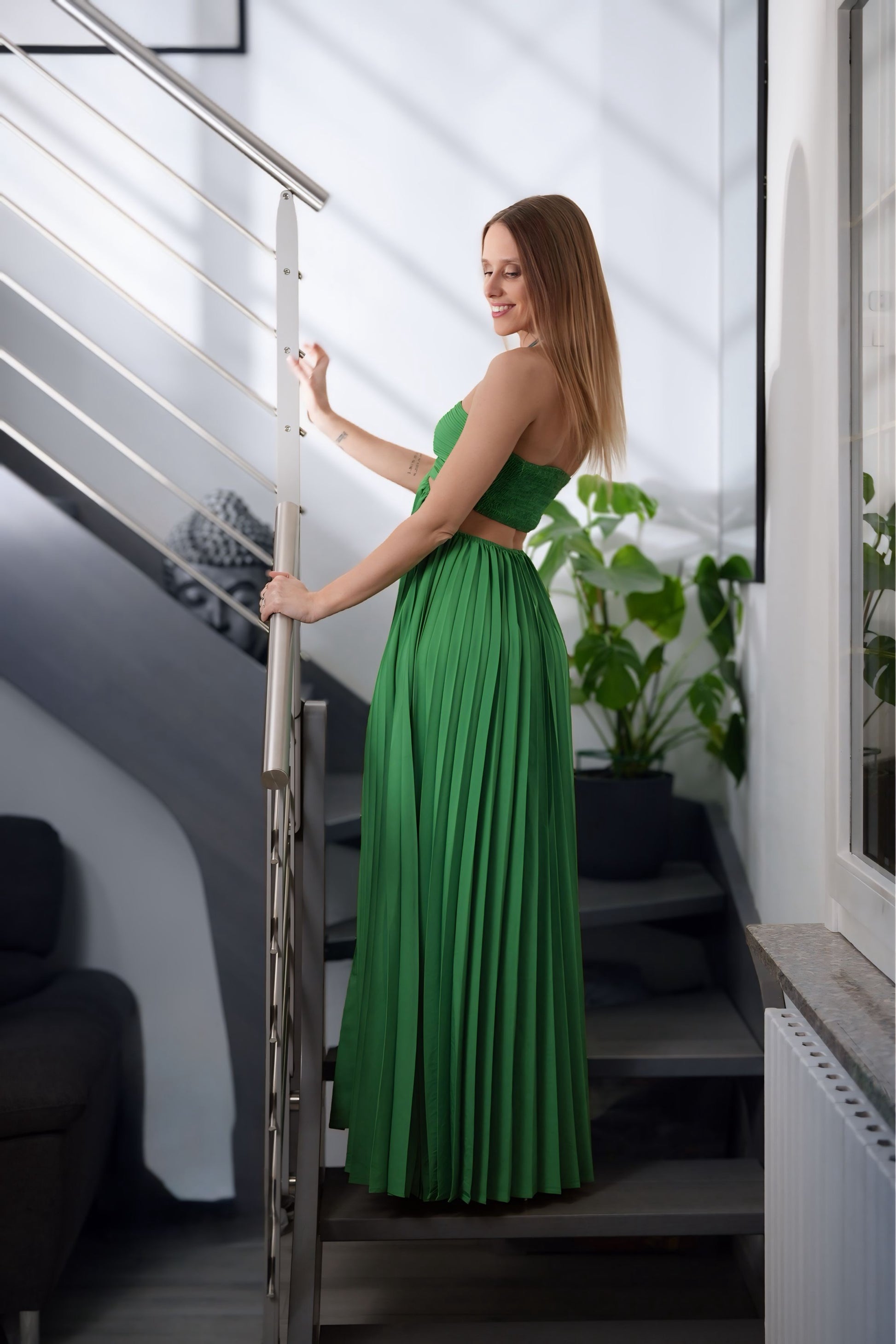 Abito lungo plissettato con aperture sui fianchi. Possibilità di essere allacciato dietro al collo o con fiocco sul davanti.