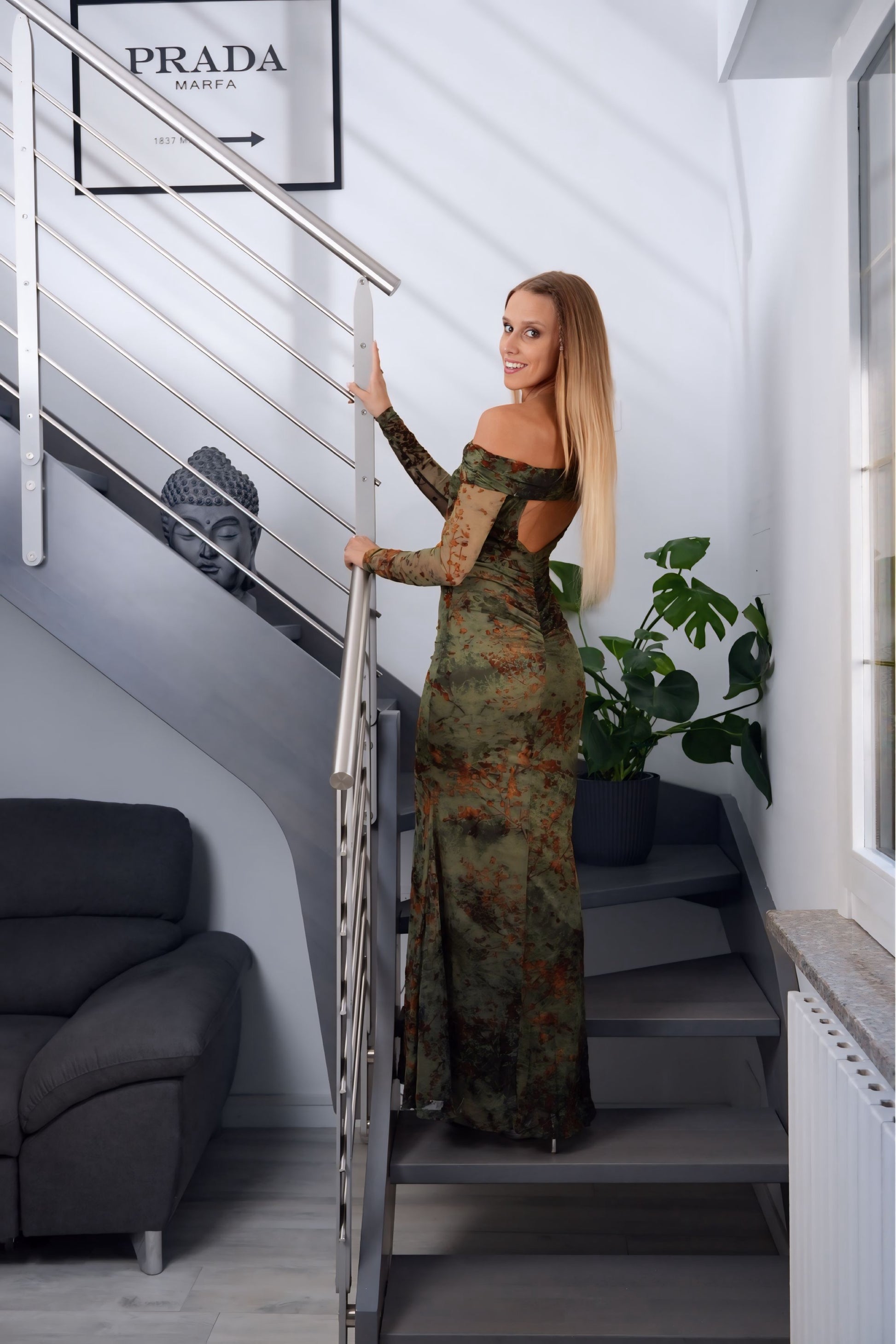 Abito a manica lunga con scollo a barca e scollo a V sulla schiena.